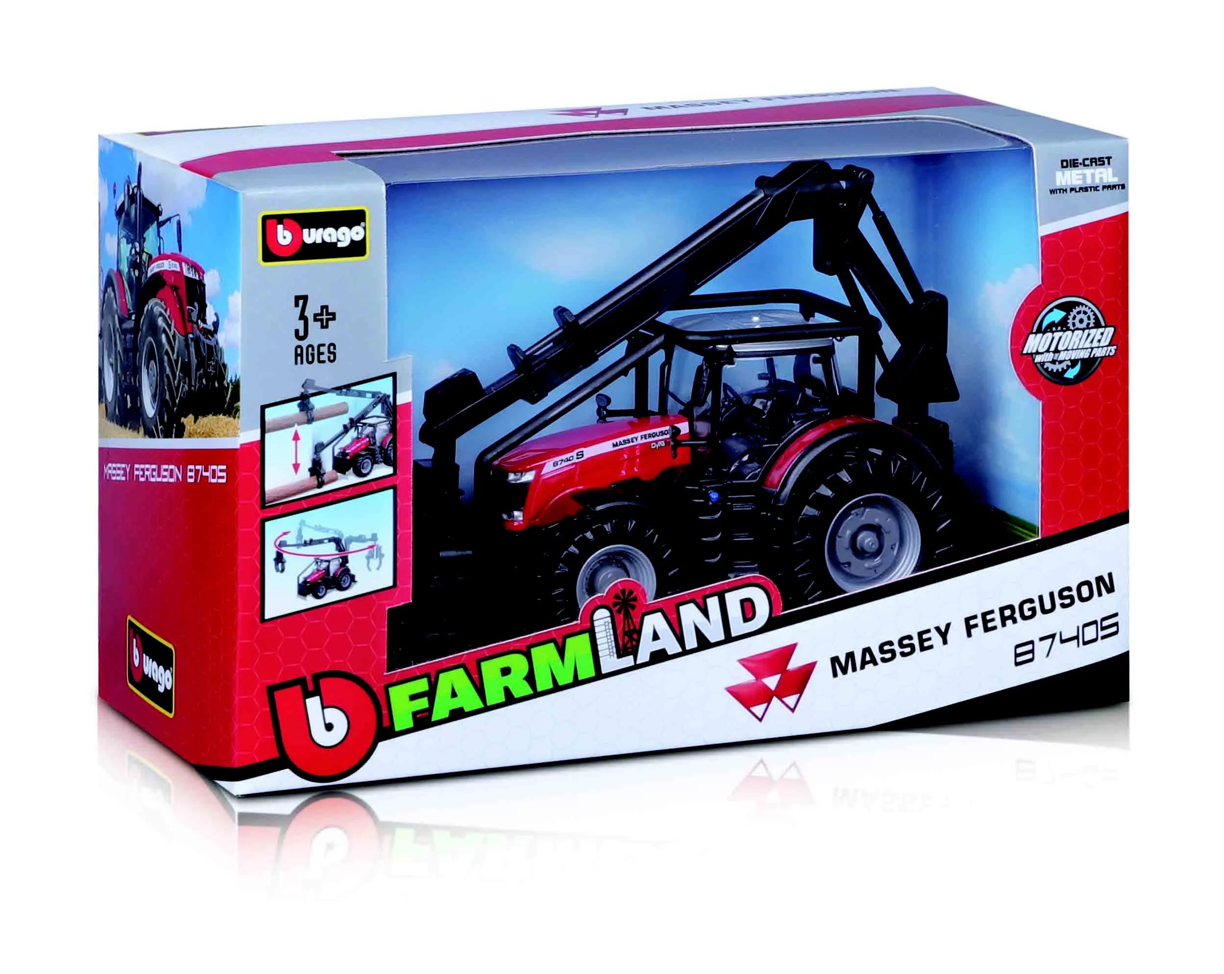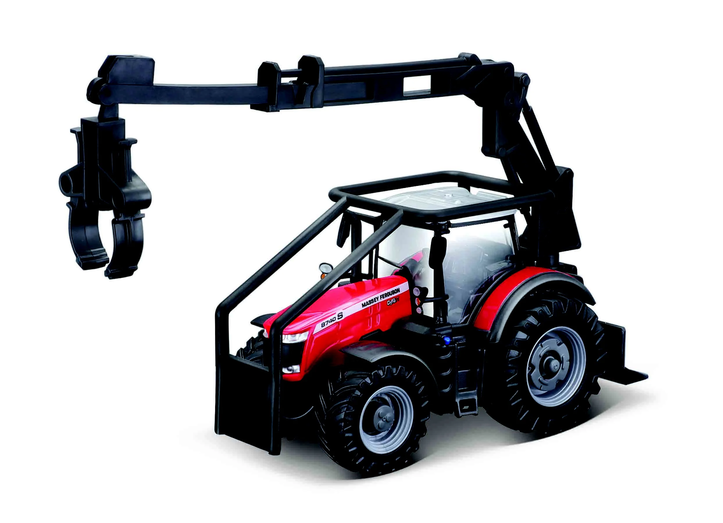 MINIATURA TRATOR MASSEY FERGUSON VERMELHO 8740S COM GRUA FLORESTAL E TRONCOS